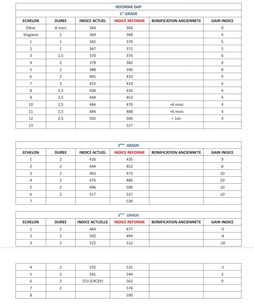 Le bloc syndical a été reçu par le DAP et ses services pour répondre à la demande formulée par le bloc syndical le 13 juin dernier, s’agissant de l’ouverture de négociation dans le cadre d’un accord collectif pour le passage de C et B du CEA et de B en A du CDC. Le DAP, nous a fait savoir qu’il n’y aura pas de négociations même si la loi le prévoit car c’est une réforme qui a été imposée par le politique et ils n’ont pas souhaité associer l’ensemble des Organisations Syndicales contrairement à ce qui a été fait à la Police Nationale, le BEAUVAU de la Sécurité, ratifié par l’ensemble des Syndicats…