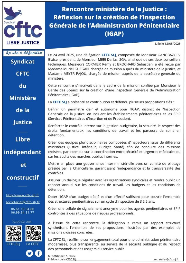La CFTC SLJ réaffirme son engagement total pour une administration pénitentiaire modernisée, plus transparente, au service de la sécurité publique et du respect des personnels et des usagers du service public.