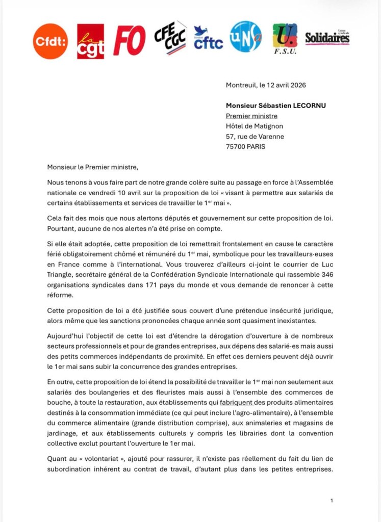 La #CFTC et l’intersyndicale interpellent Sébastien Lecornu contre le projet de loi menaçant le caractère chômé du 1er mai.Nous refusons la remise en cause de nos conquêtes sociales !Retrouvez le courrier complet ici⤵️